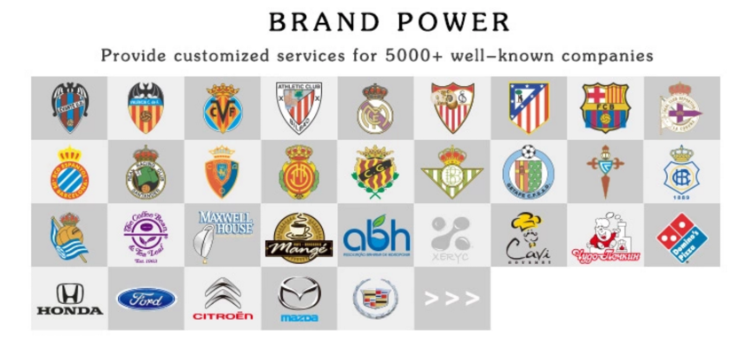 We cooperate with many famous companies, shops and  club teams, such as CocaCola, MoneyGram, Walmart, Midea, Pepsi, Olympics Games, WorldCup Football Games, Asia Sports Games and so on.
